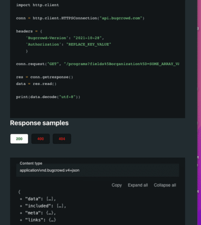 Researchers can use Node.js, Shell, Ruby, Python, and many other programming languages to integrate the Bugcrowd API with their custom tools and with commercial tools such as Burp Suite (see code samples). We also have a RESTful API based on HTTPS requests and JSON responses, secured with API tokens. For example, a researcher may use the API to fetch all unblocked assigned submissions.