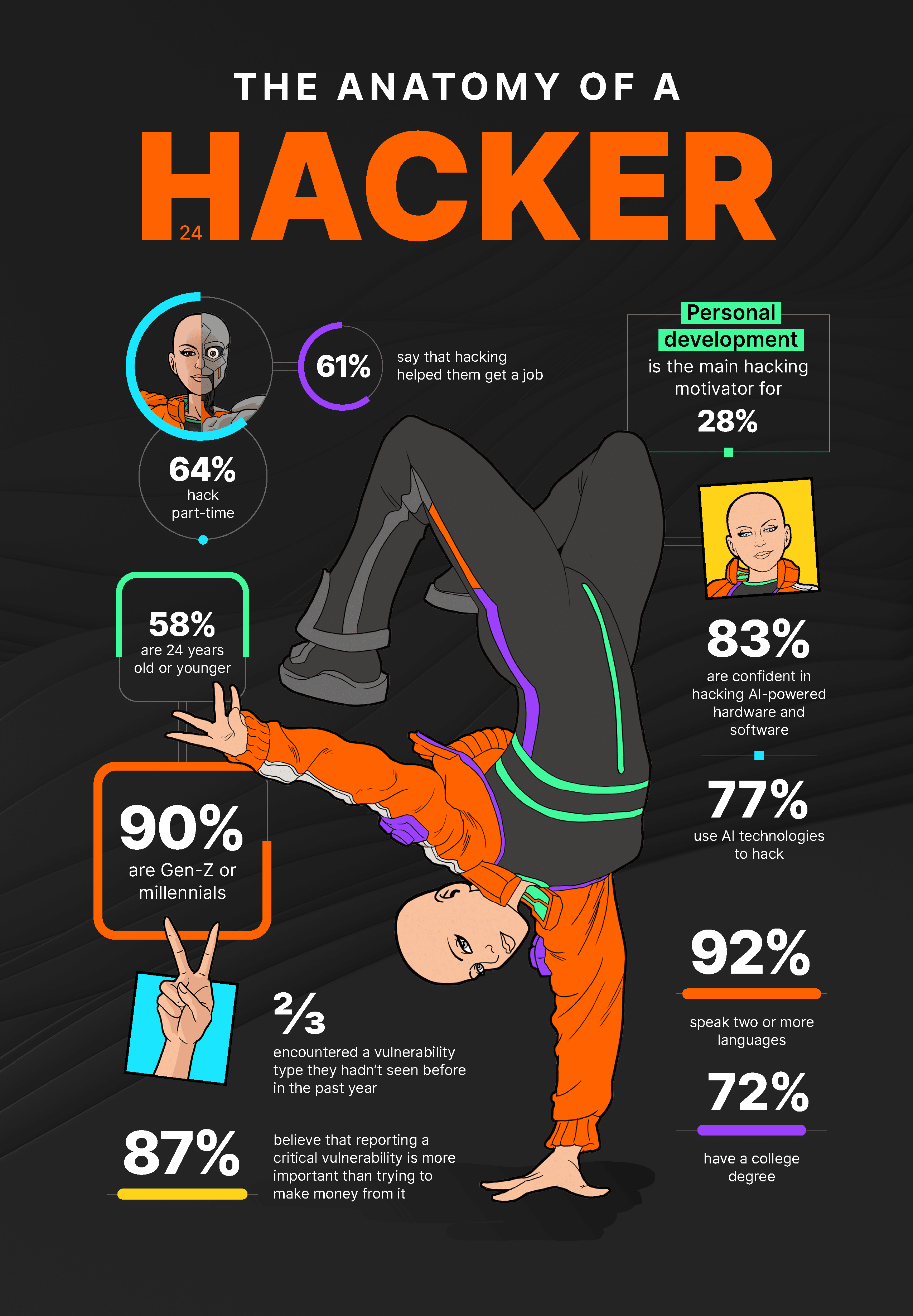 1. Hacking is a viable income source. The vast majority (90%) of hackers are Gen-Z or millennials. Younger generations are flocking to hacking and reaping the benefits. 61% cited that hacking helped them find a job. 59% are hacking fewer than 14 hours per week, making hacking the flexible income source that is so desirable right now, especially considering it can be done at home (or anywhere else in the world, for that matter).