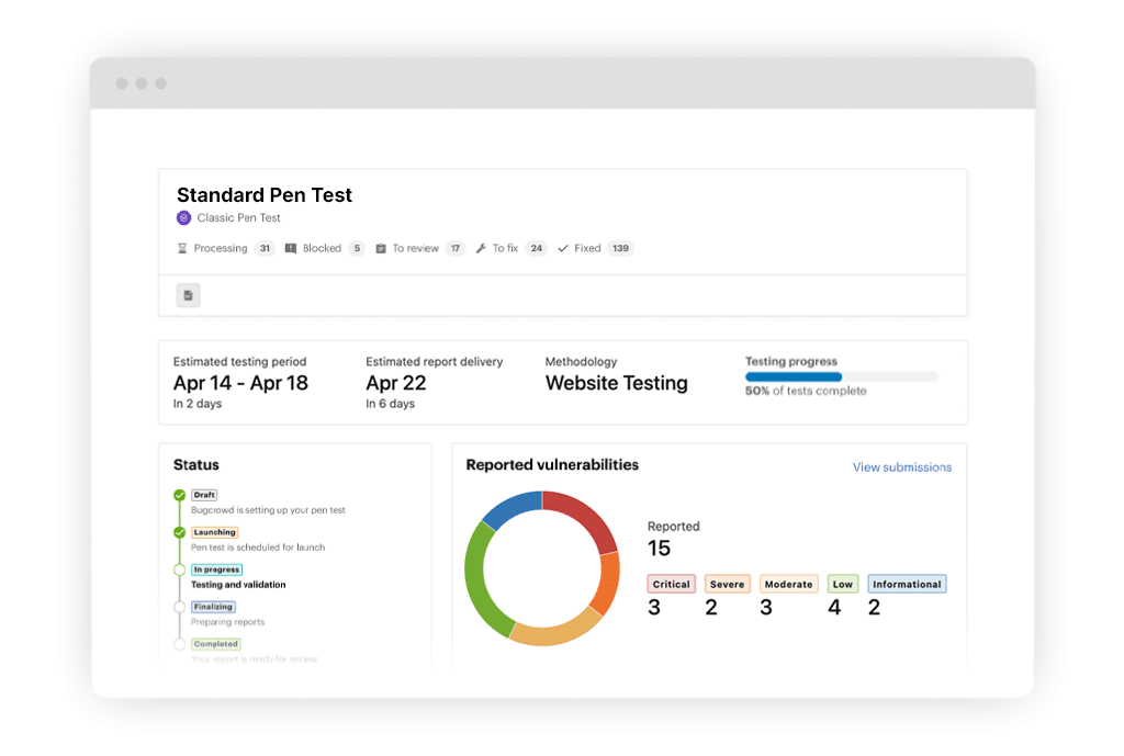 Never be in the dark about your pen test results again. You can view prioritized findings, action items, analytics, and pentester progress 24/7 through the methodology checklist in a rich dashboard designed specifically for pen testing workflows. When ready, your final report is available for download from the same dashboard. Similar experiences for your other Bugcrowd solutions are just clicks away.