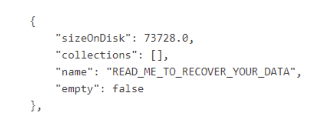 The name READ_ME_TO_RECOVER_YOUR_DATA immediately suggests that this service has been subject to a ransomware attack and the contents of this database will contain the ransom note. This is a deeply saddening reality a lot of companies will face if they don’t take the appropriate measures to identify their attack surface and update their assets. Individuals could also be affected in similar ways, with personal files (such as photos) being encrypted in the same undiscriminating and ruthless manner as this database.