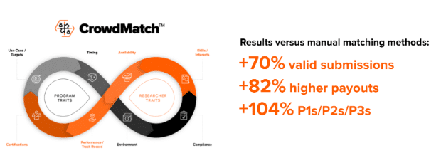 CrowdMatch, like any other ML engine, just gets better as the data on which its trained gets better. Thanks to data spanning a decade–derived from the Bugcrowd Platform’s rich Security Knowledge Graph, which connects millions of data points about vulnerabilities, environments, assets/targets, and researcher profiles that we’ve curated over 1,000s of customer experiences–CrowdMatch has taken the value it delivers to researchers and users to an even higher level. In fact, CrowdMatch results versus previous matching methods are now touching triple-digit territory, with valid submissions up by 70%, payouts over 80%, and the number of P1s/P2s/P3s logged by researchers doubling!