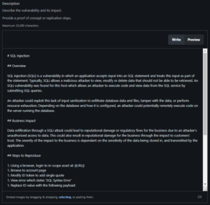 With each template, you’ll find additional guidance to help you understand what triage and customers are seeking when validating each VRT category. For example, when you select SQL Injection, you’ll find the following on the left-hand side: