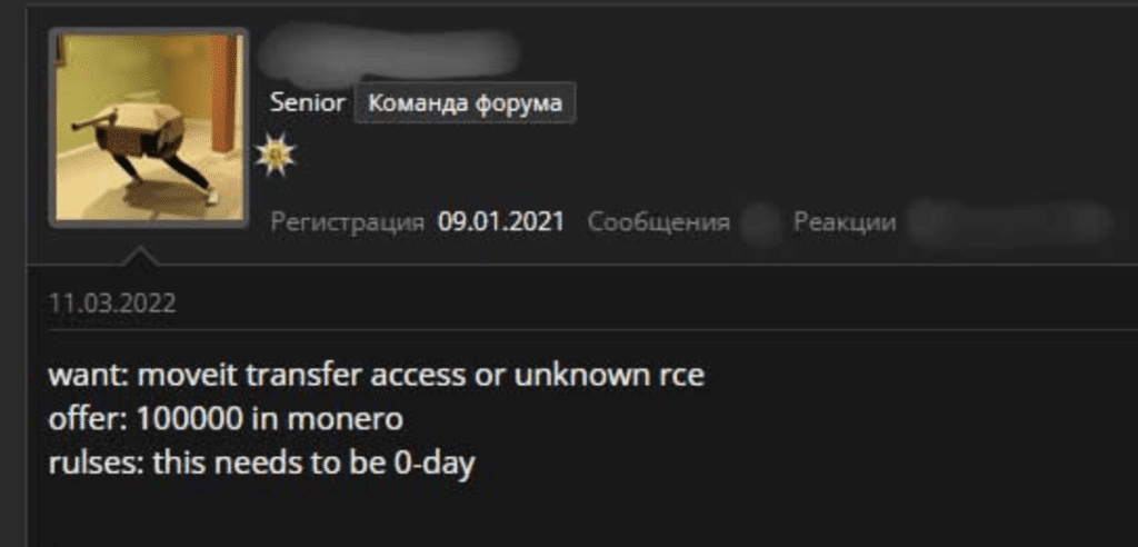 Central to this attack was the deployment of a zero-day exploit. Whether this vulnerability was a product of Clop’s own cyber reconnaissance – or, what seems more probable, procured from a dark web forum – it provided a digital crowbar to pry open defenses. Sifting through dark net forum posts reveals indicators that threat actors were actively paying large amounts of money for high-impact vulnerabilities: