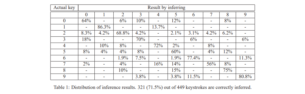 For the numerical keyboard (the one displayed when making phone calls), TouchLogger was able to infer, with 71.5% accuracy, which digits were input.