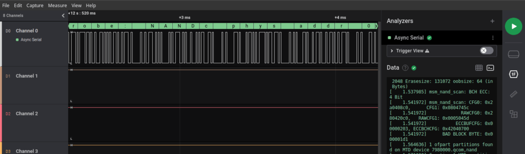 Once you identified the ground pin, it’s time to setup your logic analyzer. Plug the remaining 3 pins to the Channels 0 to 2 of the logic analyzer and ground to ground. Now start the measuring process for around 10 seconds while turning the target board on.