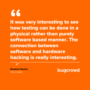 The missing piece was the hacker I had in mind—Erik de Jong. Erik is a community-driven hacker and brilliant educator living five thousand miles away in the Netherlands. Not only that, but he is a hardware hacking all-star on the Bugcrowd Platform and a live hacking leader at our Bug Bash events. Erik agreed to help and was excited to help us build out a new hands-on, educational pilot for university organizations.