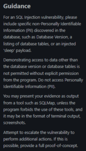 Take SQL Injection as an example. These can often be a false positive due to system variable timing creating alerts in tools (time based blind SQL Injection). By following the above guidance, you will see that where possible, you should produce a payload which retrieves the destination database name with your finding (a safe method which doesn’t expose core data of that system). If you’re finding initially has this, it limits the steps that triage and yourself need to go through to satisfy validation of your finding.