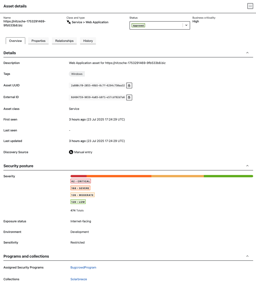 From a single screen, teams can view posture, exposure status, ownership, environment, and associated programs or collections. Editable business criticality fields allow teams to reflect real-world impact—helping prioritize based on what’s at stake, not just what’s vulnerable.